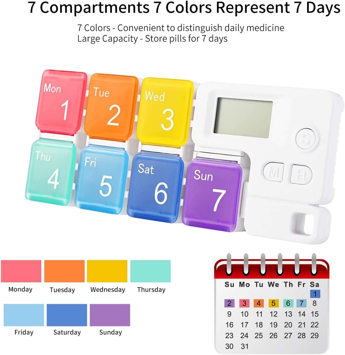 Tedenski razpored za 7 dni ohranja vaše tablete urejene in zaščitene pred vlago. Vsak predalček je enostavno dostopen in vam pomaga, da na prvi pogled načrtujete terapijo za cel teden.