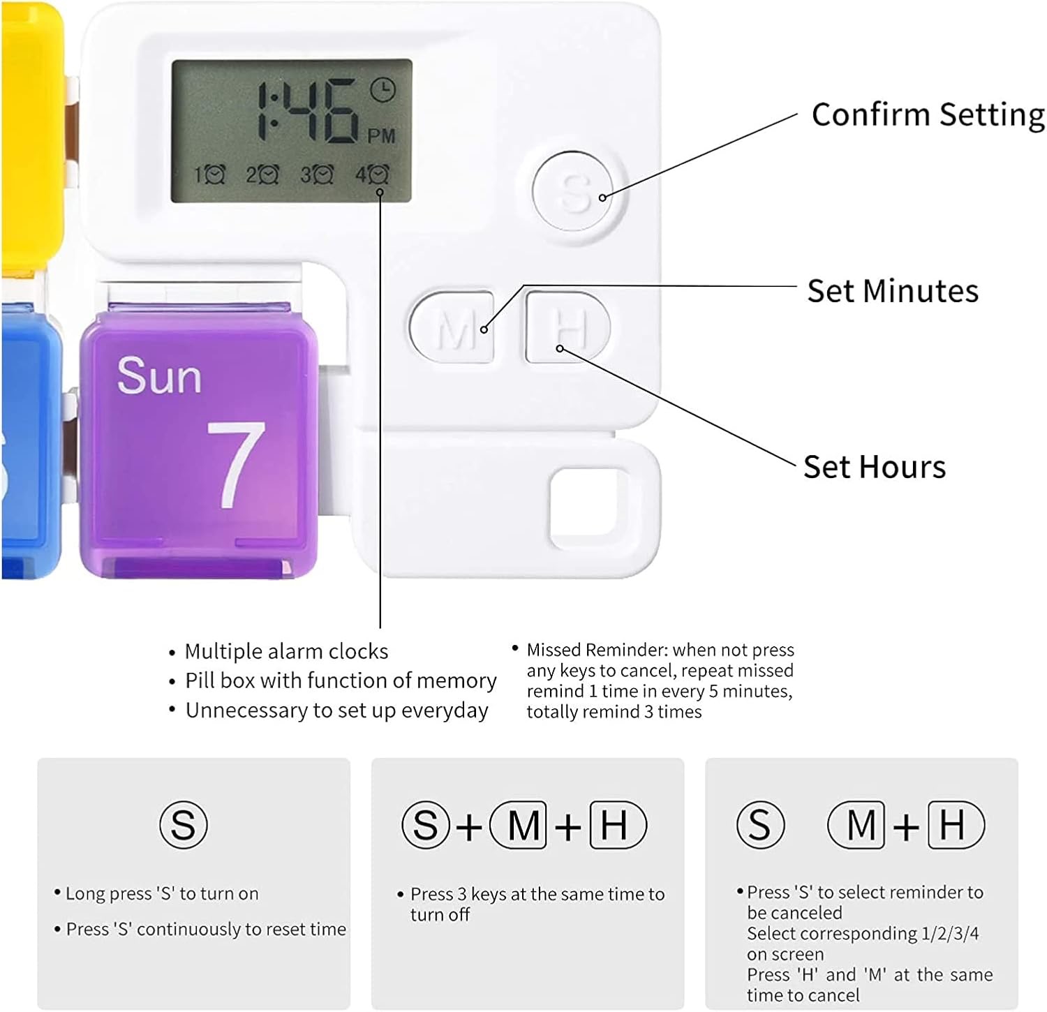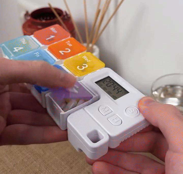 Odstranljiva struktura naredi škatlico za tablete praktično za prenašanje v torbi ali žepu. Pregleden zaslon prikazuje čas in nastavitve, kar omogoča hitro in preprosto prilagajanje, kadarkoli je to potrebno.